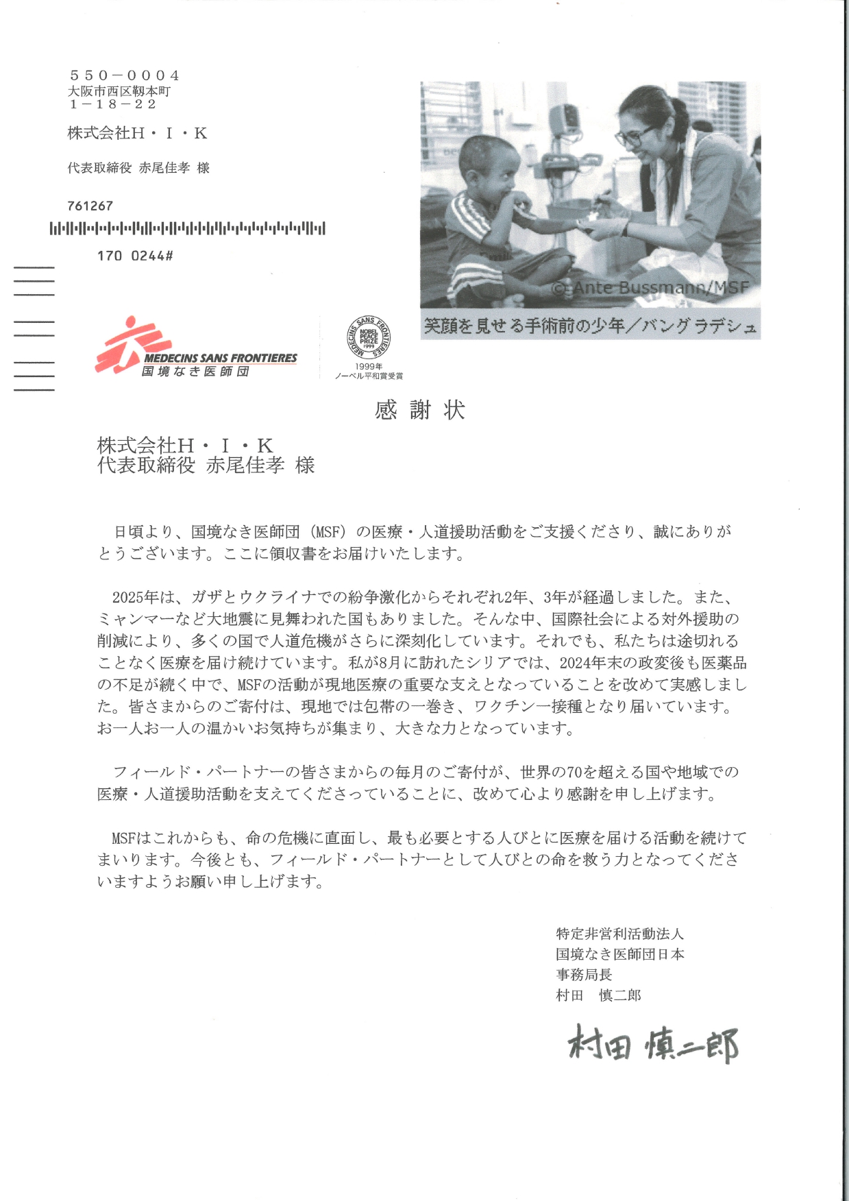 昨年に引き続き、本年もこれまでの支援活動に対し、国境なき医師団より感謝状を拝受いたしましたので、ご報告申し上げます。